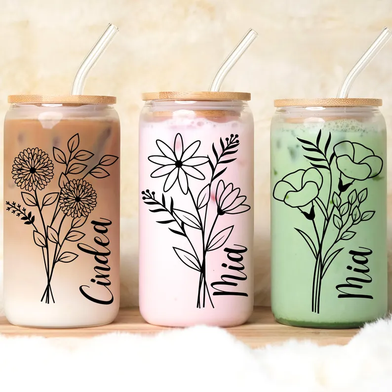 Personalized Glass Cup | Custom Iced Coffee Tumbler | Aesthetic Floral Drink Cup