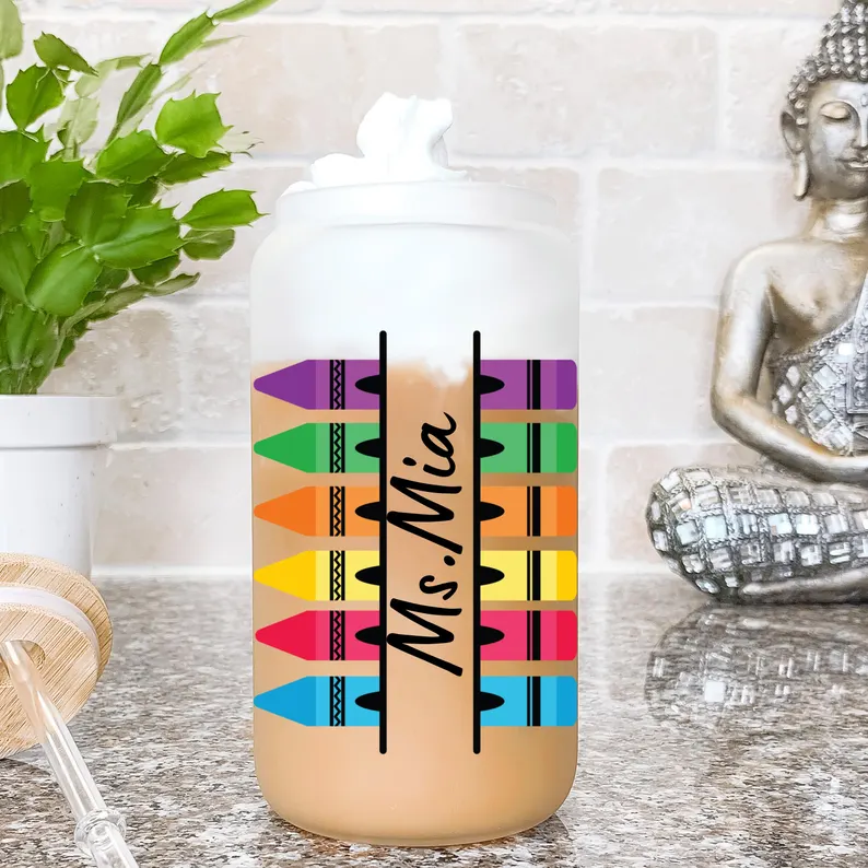 Personalized Teacher Cup | Custom Name Beer Can | Rainbow Crayon Coffee Tumbler