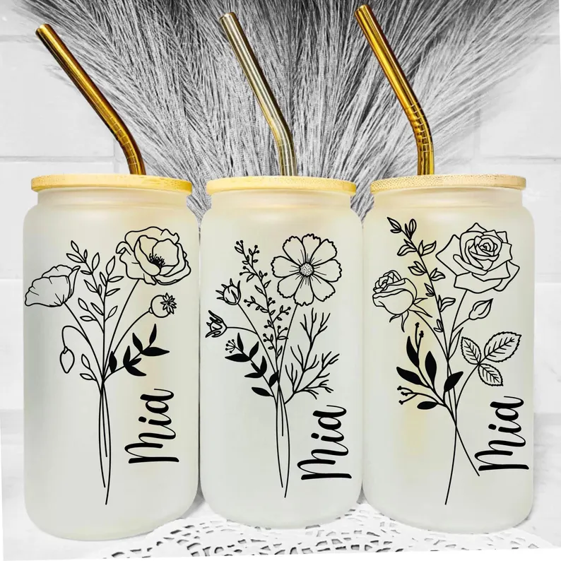 Custom Frosted Flower Glass | Personalized Iced Coffee Tumbler with Straw